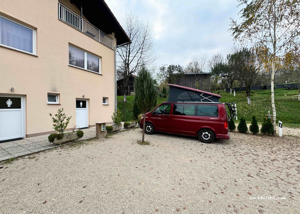 Saubere Sanitäranlagen und Rastoke fußläufig zu erreichen. Wer nicht an der Straße laufen will: Auf der gegenüberliegenden Straßenseite etwas rechts geht ein steiler Asphaltweg zum Fluss. Am Fluss kann man dann einem kleinen Pfad bis zur Burg folgen und ist von dort schon fast dort. Habe allerdings 20€ für 1 Person mit Hund im T4 pro Nacht gezahlt… ist wohl ok für die Region.