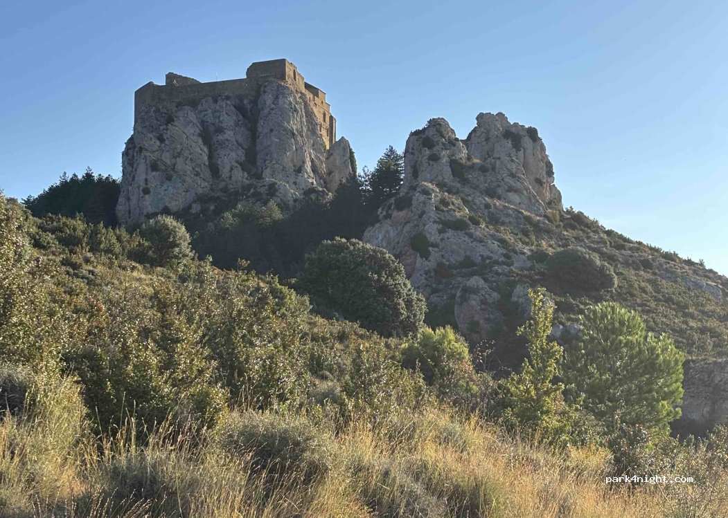 At the foot of Louare castle. No service. Unheard of view over the castle and to the south over the Aragon valley. For van and small van only. 150 meters from the road that goes up to the castle on a dirt track. The silence and the stars at the foot of a thousand-year-old castle ...