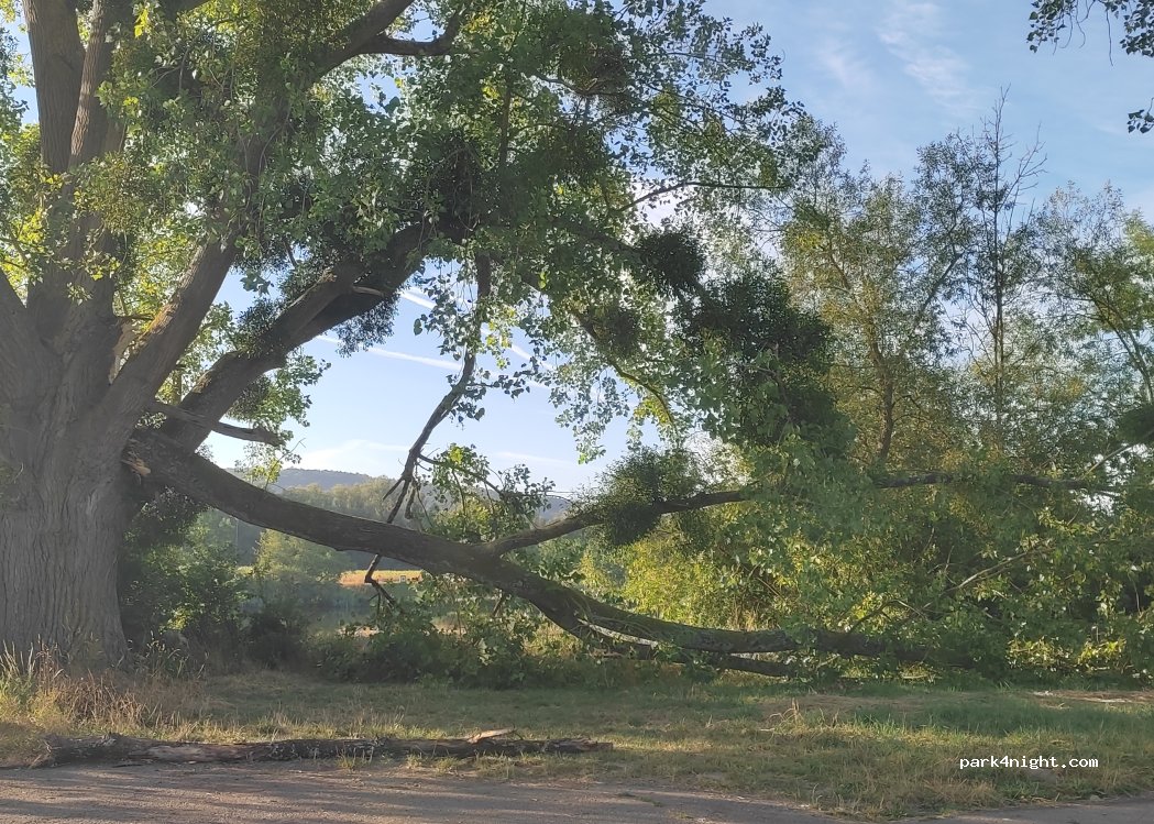 Parking towards road bike without visible ban for overnight parking. At the foot of a large tree, on the banks of the Moselle. Overlooking the village. Flat asphalt. Near a busy road. No trash, also a lot of waste in the vicinity.
