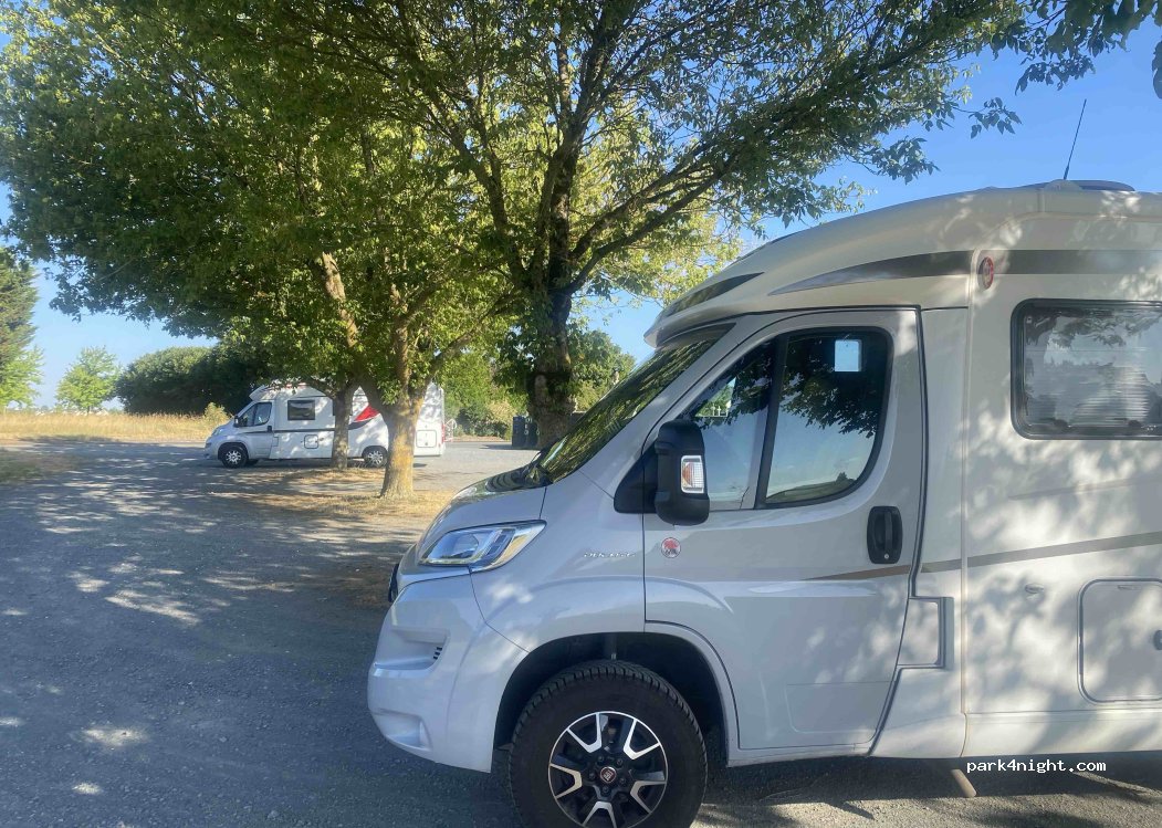 Grand parking plat, nuit tranquille plutôt calme malgré la route à proximité. Manque de poubelles (juste tri papier et verre sur place)
