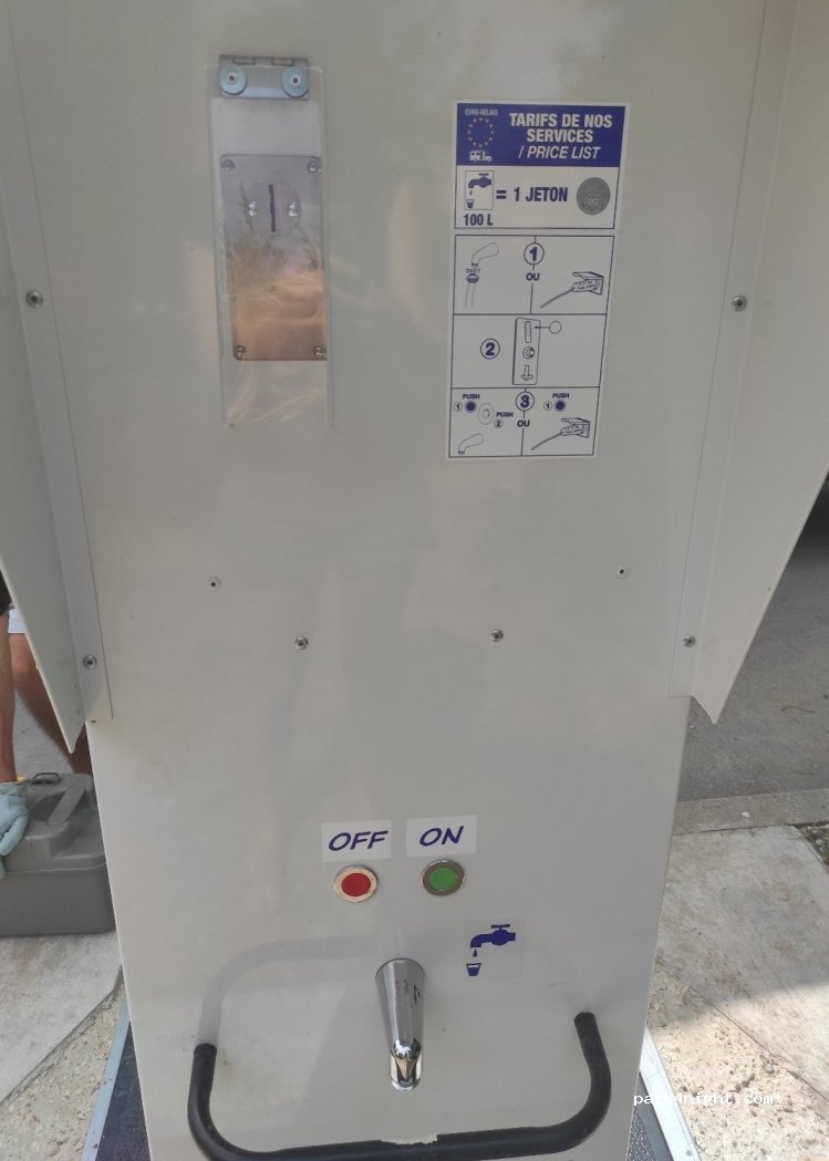 borne euro relais au drive Leclerc de TOURNON sur RHONE en rentrant à gauche vers pompes à essence je n ai pas utulise eau électricité avec les jetons mais utilisation gratuite top du vidage eau noire avec robinet d eau de rinçage qui fonctionne et eau grise
