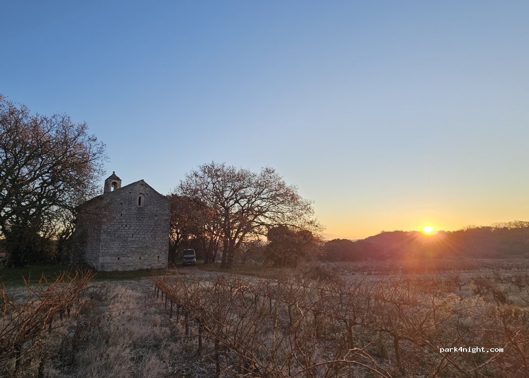 un super endroit pour dormir , nous n'avons pas vu de panneau "camping interdit" autour de la petite chapelle (on a regardé attentivement). endroit calme avec ciel entoilé. un des meilleurs spots que nous ayons eu l'occasion de tester avec notre Kangoo. chemin étroit pour y accéder au milieu des vignes.