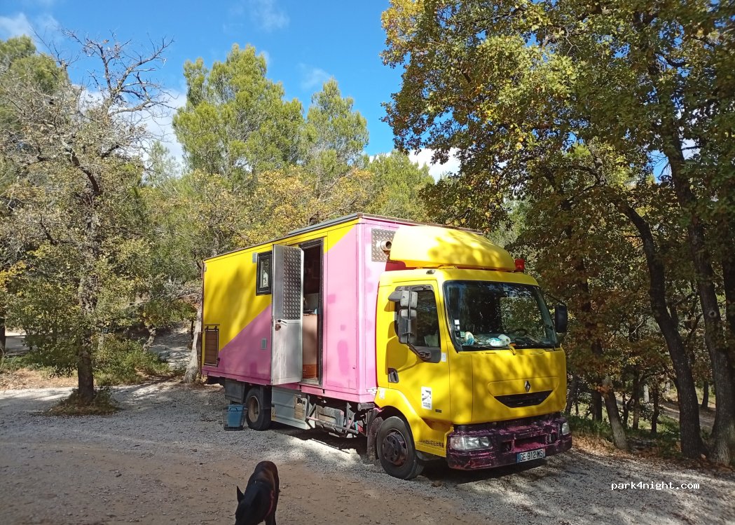 très calme le soir et la nuit mais en journée pas mal de vttistes c'est d'ailleurs pour ça que nous sommes ici. des tables en bois à disposition, route un peu étroite et un passage assez raide en sortant de Laudun pour monter au spot. beaucoup de places.