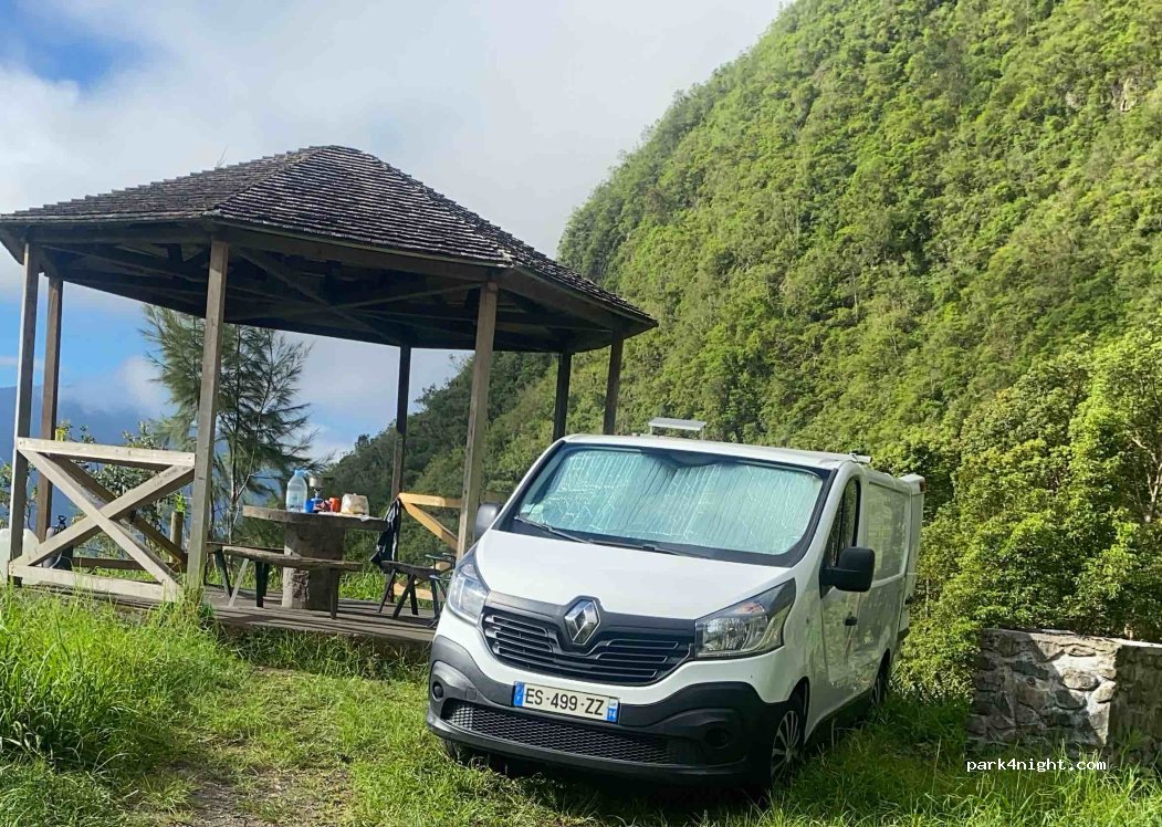 Kiosque agréable, sur les hauteurs de Hell bourg. Il y en a 2 mais un seul permet d’être stationné sur terrain plat. La station fait un peu de bruit mais c’est totalement supportable (les grenouilles font à certains moments plus de bruits que la station). Belle vue, notamment le matin avec le lever de soleil sur les remparts de Salazie. Attention quand même au arachnophobe. Il y a quelques araignées qui ont élu domicile sous le toit du kiosque. Globalement, elles sont petites, mais il y a un ou 2 spécimens qui peuvent impressionner.
