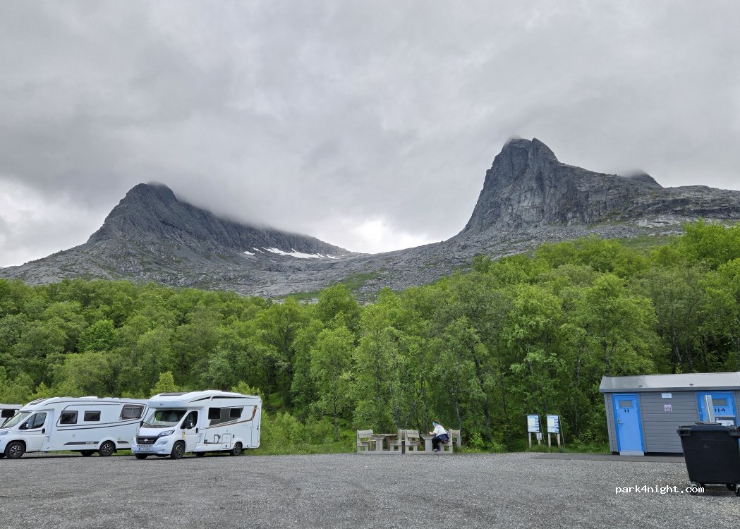 Grand parking au départ des randonnées au Skjæringen et Tvilling (bien corsées et techniques), du coup beaucoup de monde en journée mais peu y passent la nuit (8 véhicules la nuit où nous y étions). WC modernes et propres, eau non potable. Peu de bruits de circulation pendant la nuit.