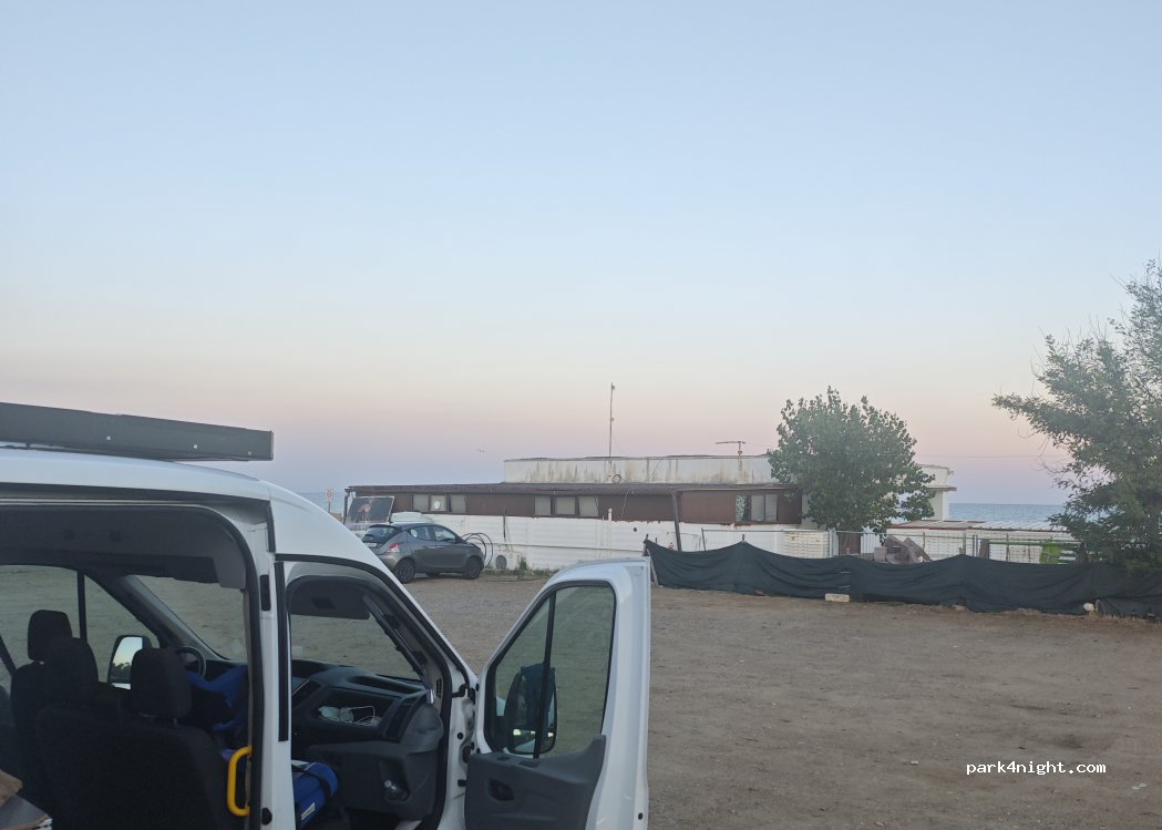 good parking spot. we parked at the end of the road on gravel parking spot. Next to parking are beach bars and to the left are public beach. Felt safe, during the day at the sea.