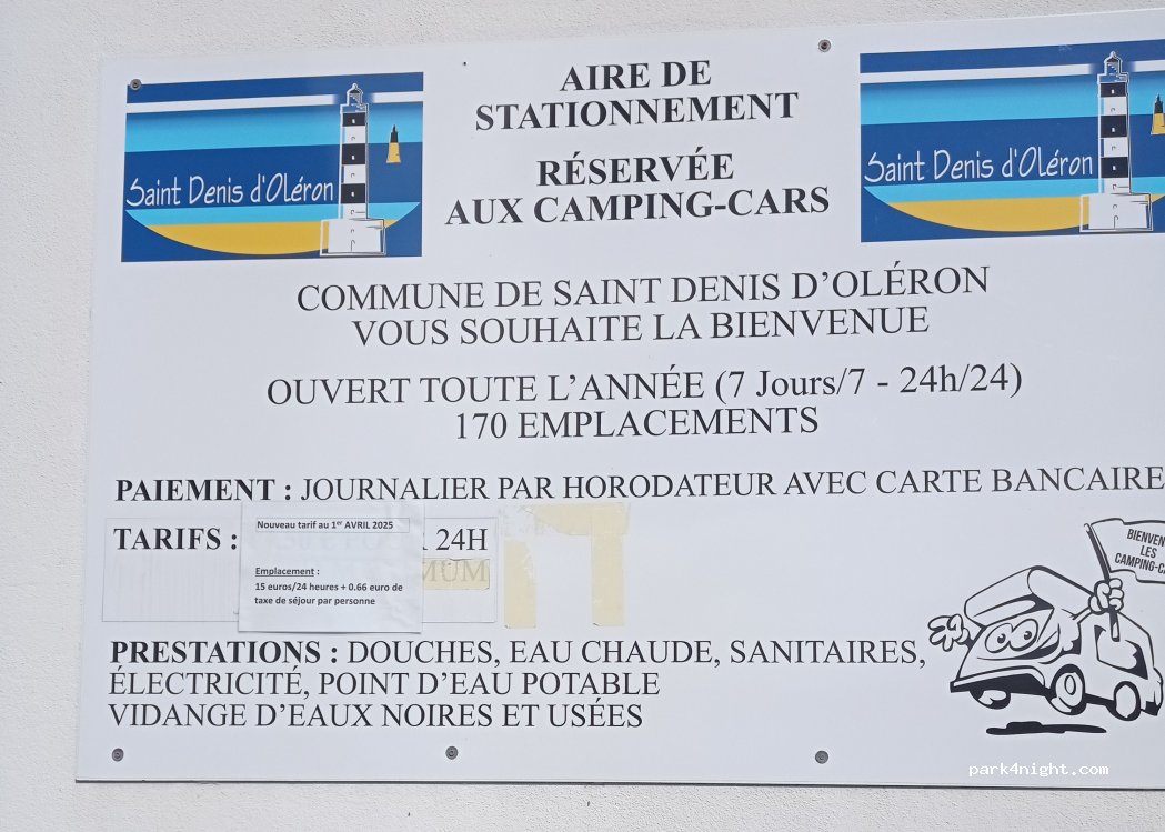 Remerciements à la municipalité de Saint Denis d'Oléron pour cette transformation d'ancien camping en une aire de camping-car. Cependant, alors qu'il y a eu une augmentation de tarif de 9 € à 12 € (33% d'augmentation en 3 ans), cela mériterait qu'il y ait un détartrage régulier des WC qui laissent à désirer. A noter que pour l'aire de camping-car du Château d'Oléron, basé sur le même principe de transformation d'un ancien camping, le tarif est resté à 11 €, et les sanitaires sont beaucoup mieux entretenus.