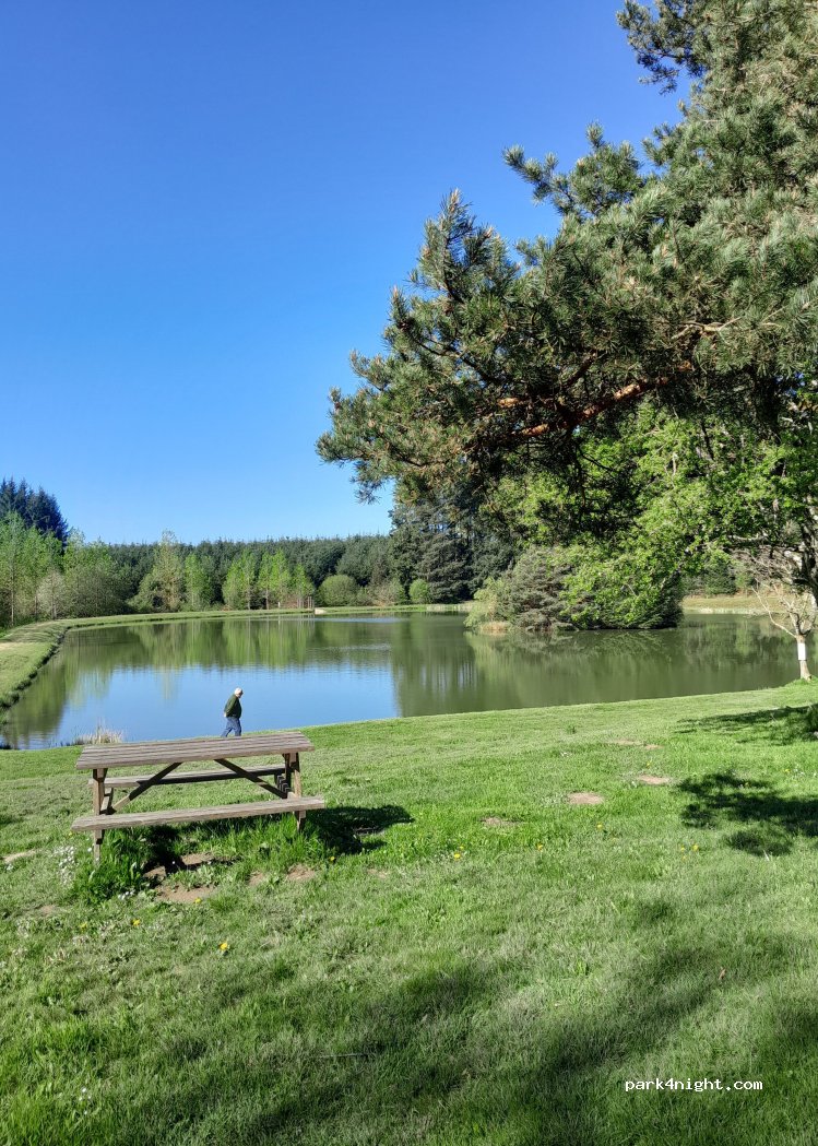 Accessible facilement en fourgon et très tranquille, terrain plat pour passer la nuit. il n'y avait personne. toilettes et tables de pique nique à côté de l'étang.