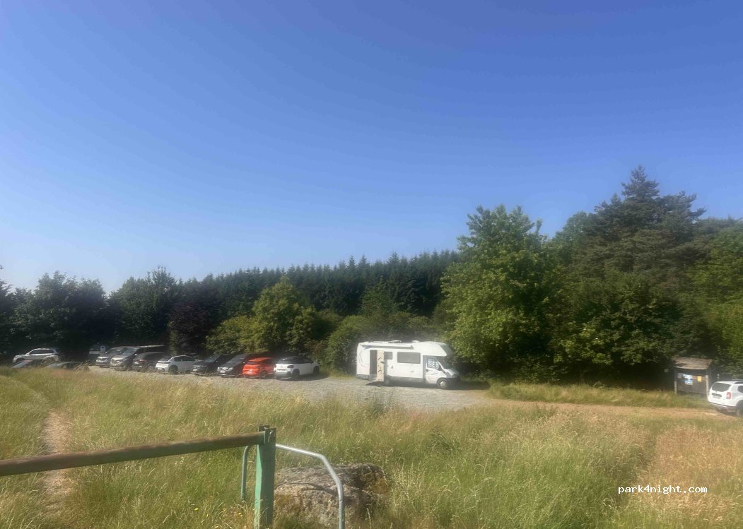 Grand parking un peu en pente mais très bien pour passer la nuit au frais et dans le calme. Table de pique nique + toilettes Eau non potable et pas de reseau Petit étang sympathique