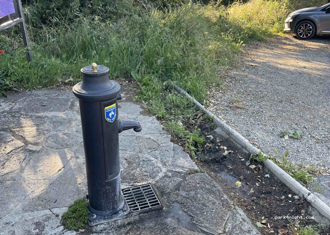 The parking is pretty big, but it is full and busy during the day. I would recommend coming around 22-23h or in the early morning before 9h, at least in this time of the year. The toilets are clean and are 100m up the hill on the left. :) There is water at the entrance of the parking, just beside the entrance. Plenty of water! There is also shadow because of the trees. Very nice place!