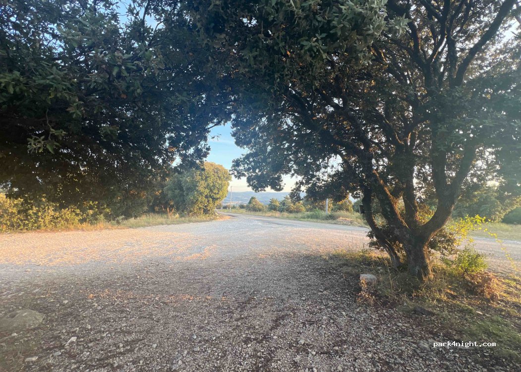 Guter Ausgangspunkt zum Mountainbiken oder Wandern. Nah an der Straße, aber wenn man hinter den Bäumen steht ist man etwas abgeschirmt und nachts ist kaum Verkehr. Relativ sonnig. Internet gut. Keine Aussicht. Etwas schief.