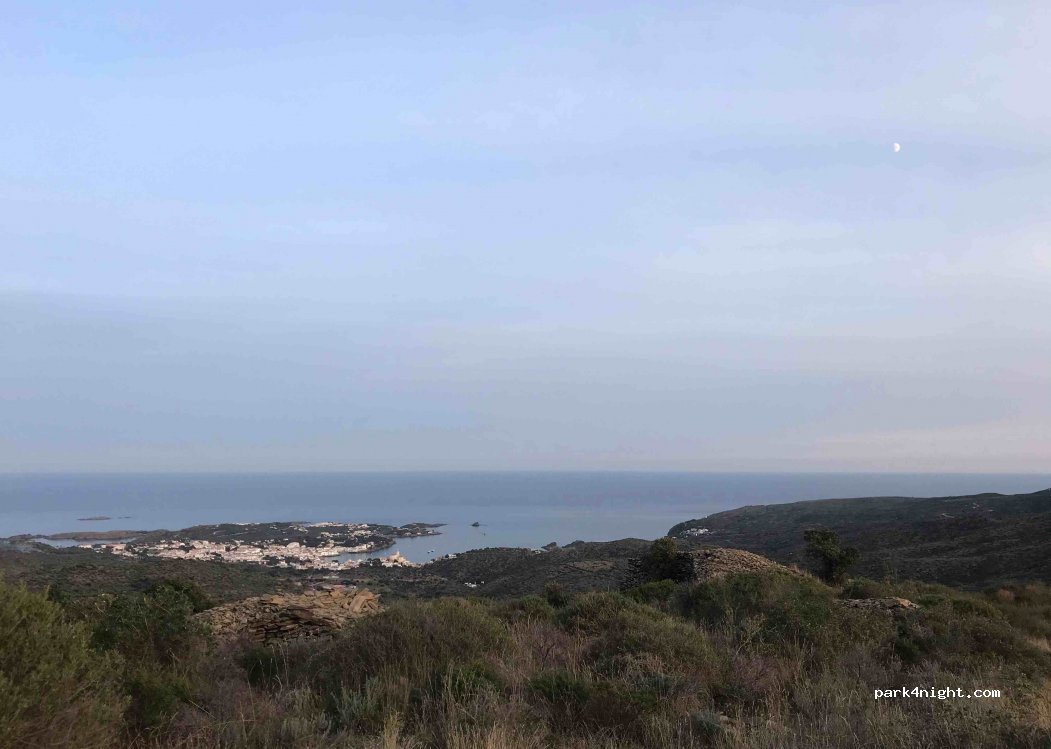 Alla fine di una strada asfaltata ma ricoperta di vegetazione, solo per un furgone. Magnifica vista su Cadaqués, ma senza ombra.
