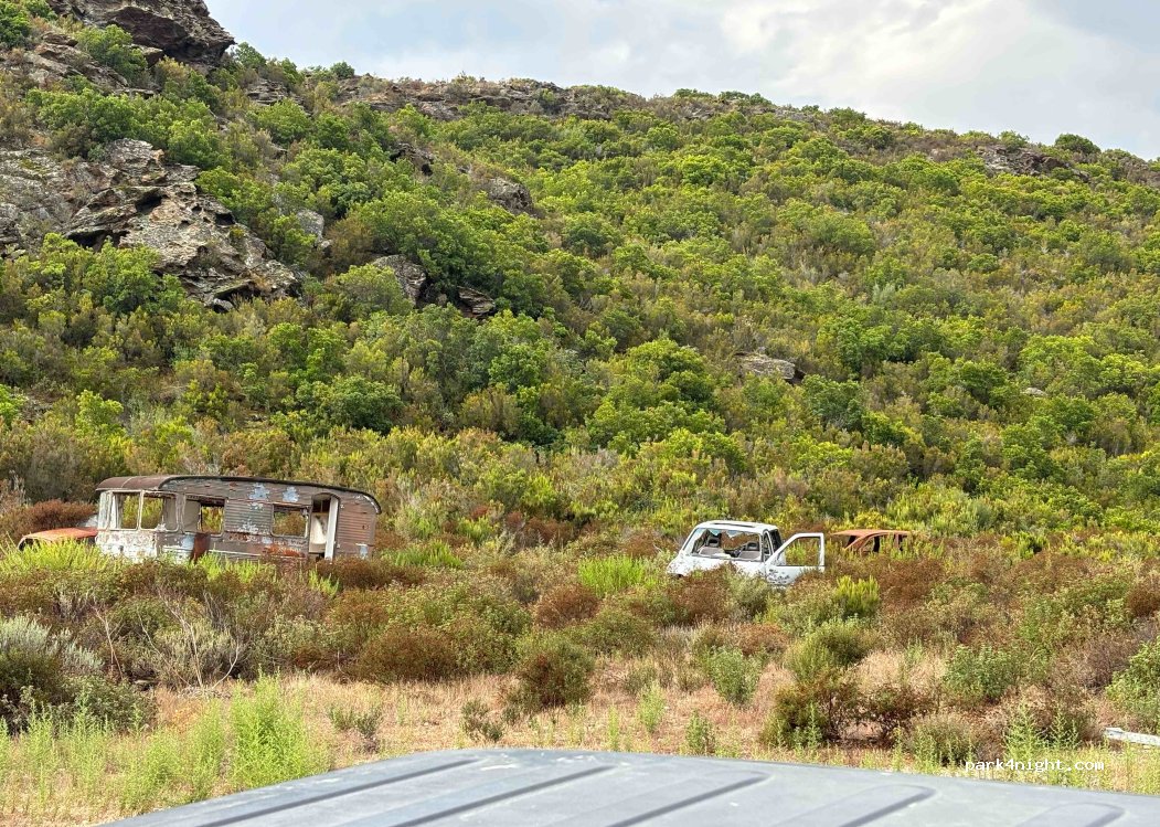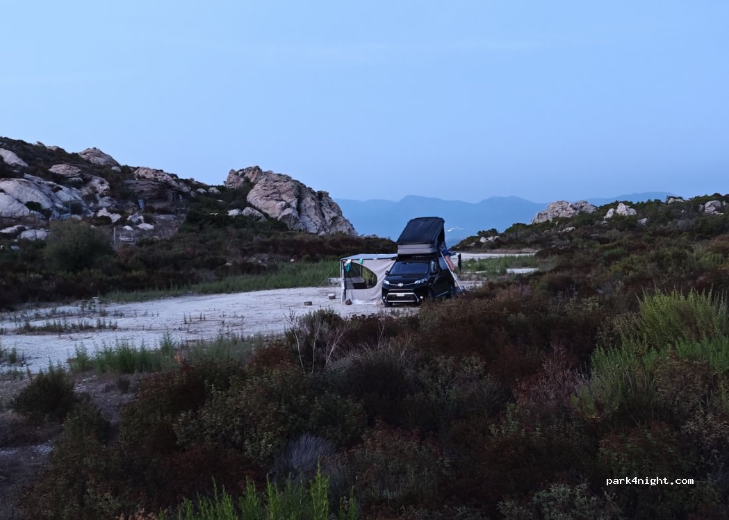 Spot accessible from the main road by a fairly rugged 4×4 path. We first arrive on a flat esplanade where it is possible to stop but we continued on the path on the left and we came to a stop on the roadside (a little sloping but settled with a wedge). It is possible to continue the path but we did not try (we are in T6). Superb view of the Agriates desert and Cap Corse! (do not park on the path because a vehicle passed by at the end of the day, surely a shepherd)