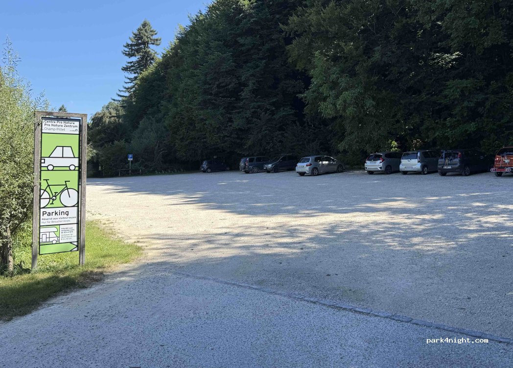 Nous sommes arrivés un vendredi soir, parking vide. Endroit charmant au cœur de la forêt. Malgré la route et la voie ferrée proches, le calme a permis une bonne nuit. Le sol est un peu en pente. Le matin, de nombreux promeneurs arrivent pour visiter le parc Pro Natura. Magnifique ! Un café ouvre dès 10h, consulter le site. Ce Spot vraiment top !