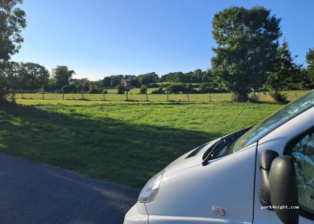 Belle vue sur le bocage Normand. Moyennement calme durant notre soirée, le camion pizza attirant pas mal de monde qui reste sur place. Mais il est parti à 22h