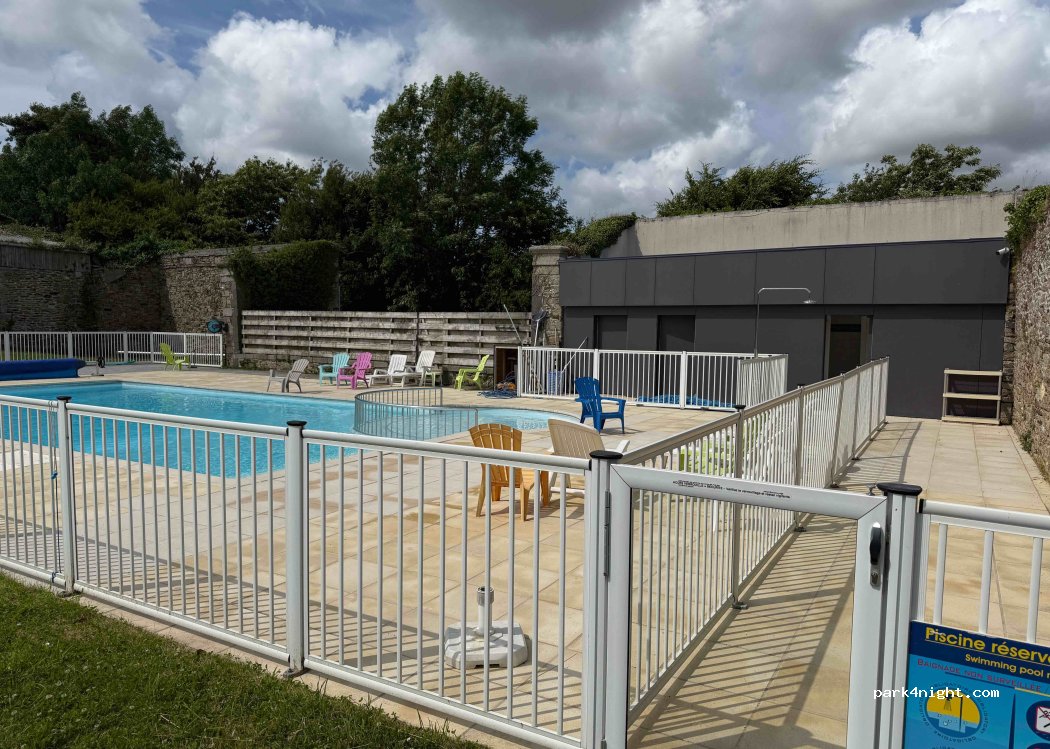 superbe endroit dans un manoir et centre équestre emplacements stables sur herbe coupée et très bien entretenue, calme, tranquille. eau, électricité sur emplacements, piscine, WC, douches. bar et crêperie. le tout pour 12€ au mois d'août, génial et bon marché par rapport à ces aires où on est entassés pour un prix plus élevé j'y reviendrai avec plaisir