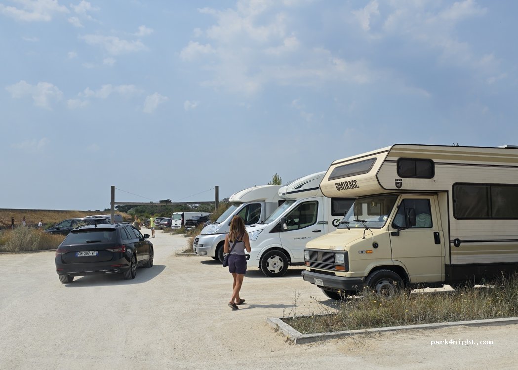 Parking illimité pour les grands camping-cars, à côté de la plage et du barrage qui contient l'eau de mer. Bon endroit pour manger ou s'arrêter en cours de route.