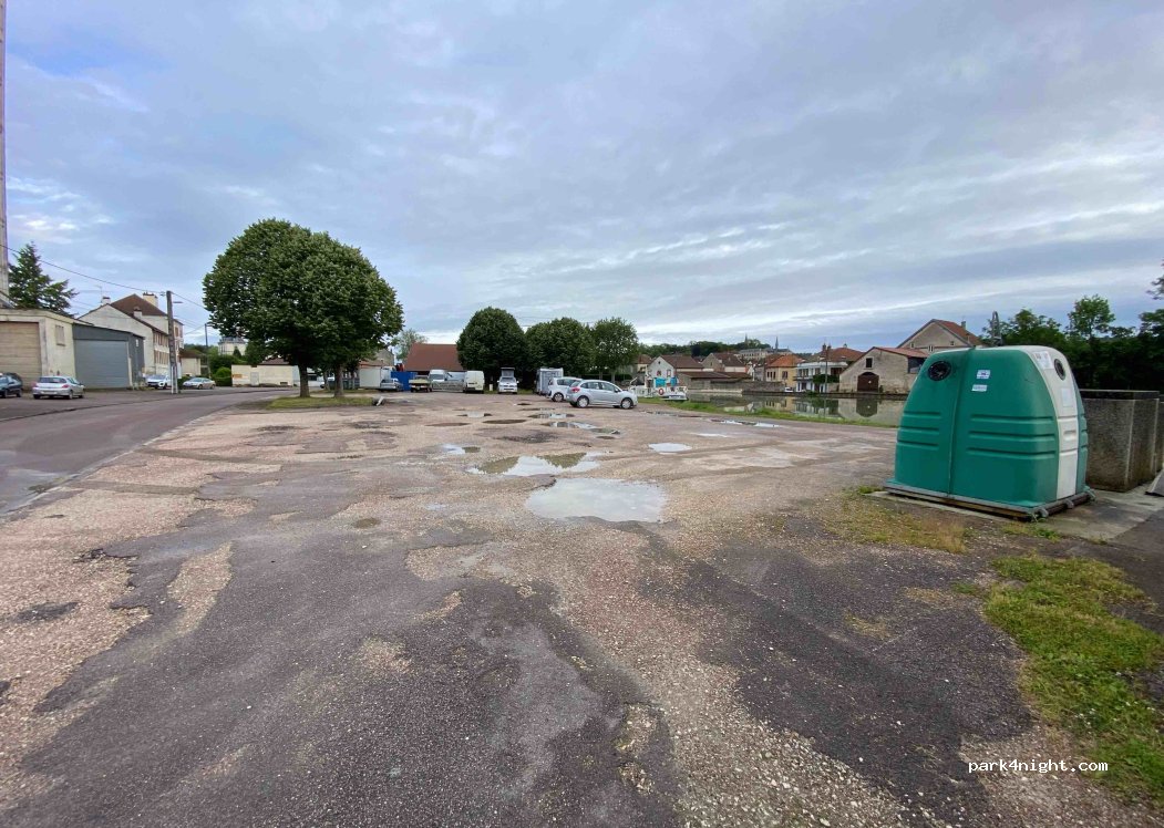 Authorized parking near the Burgundy Canal. Railway nearby. Road audible. Electricity and water, both free of charge. Garbage can. Railway line audible. Good bike route on the canal. Downtown and nearby shops.