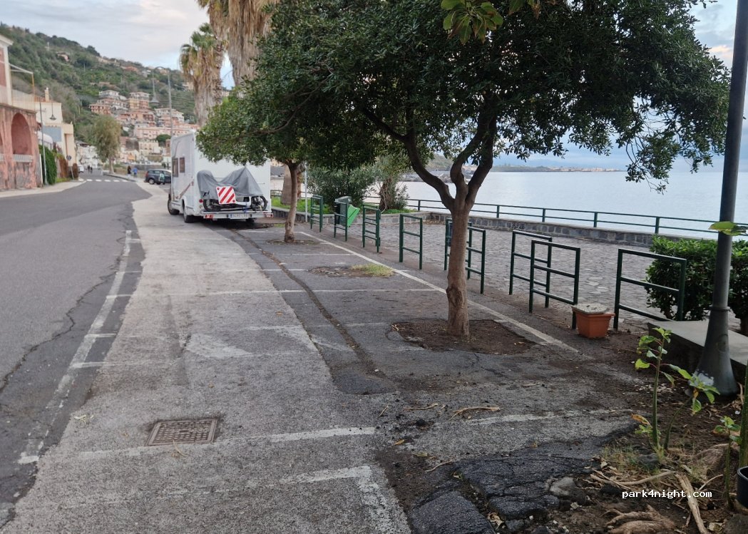 Parking au calme au bord de la plage de rochers d'Acireale. Stationnement le long de la route mais pas de circulation la nuit car c'est au bout de l'impasse.Le demi-tour se fait sans problème