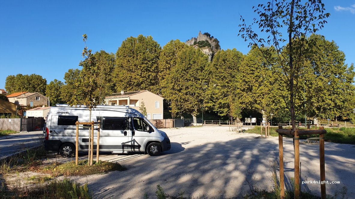 8 parkeerplaatsen bij de afrit van de stad op de rotonde D13. Gewoon vuilnisbakken. Minder luidruchtig dan de parkeerplaats van de kerk. Uitzicht op het kasteel. Voor een nacht.