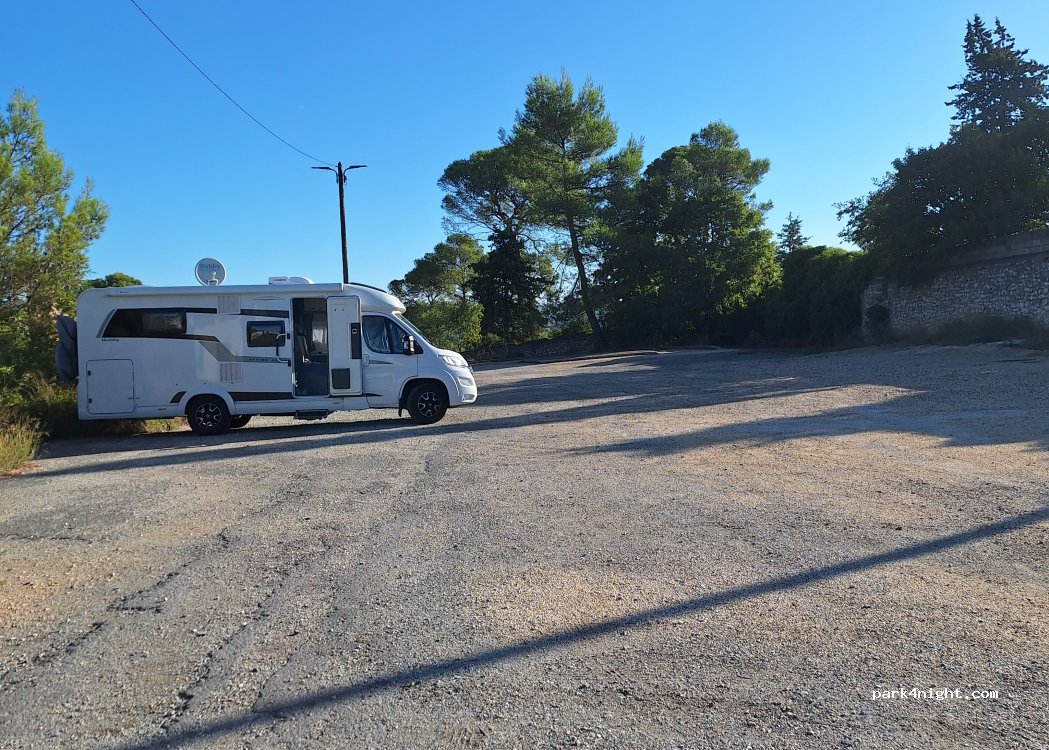 Grand parking gratuit une partie en goudron en bas et une partie en goudron gravier herbe en haut ou plusieurs camping-cars peuvent passer la nuit sans aucun bruit à environ 300 m du centre. Un vendeur de pizza à la sortie du parking. Attention, le parking du haut est utilisé par les gens du voyage très bien installés, donc inaccessible..
