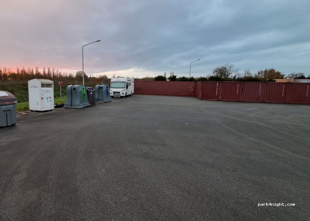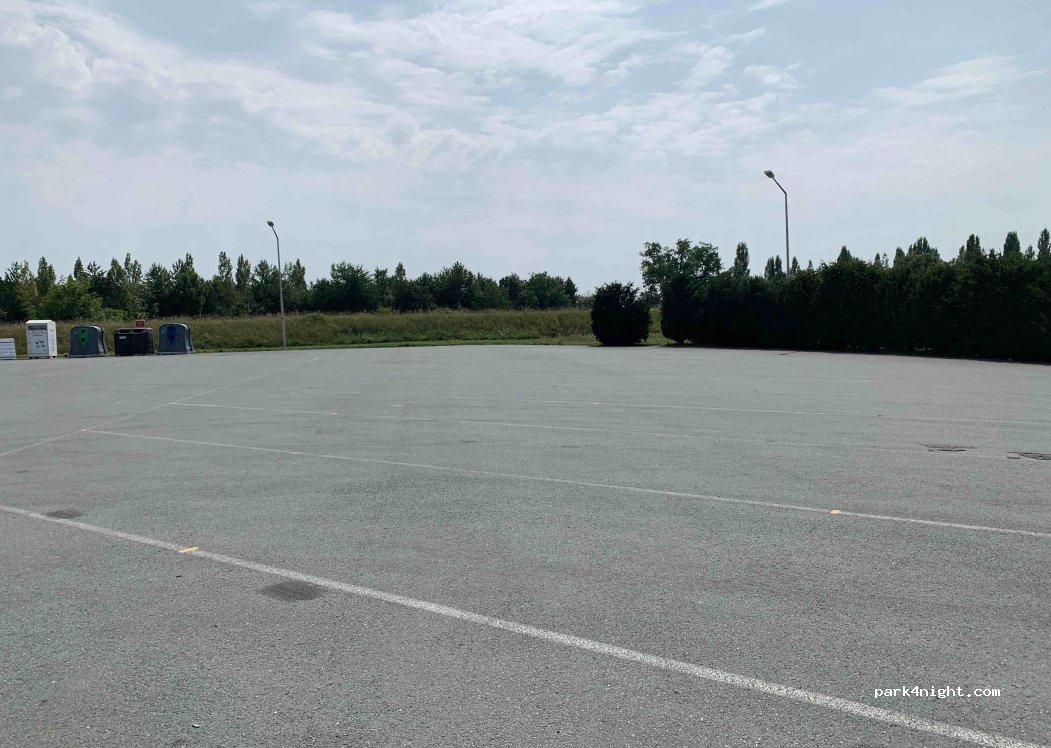 Pas d'ombre mais très calme la nuit parking immense quasiment vide, borne de vidange toutes eaux et possibilité de faire le plein d'eau.