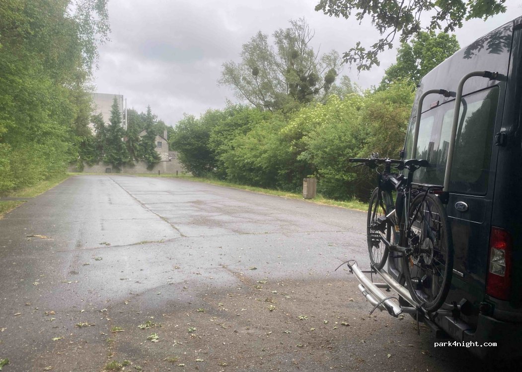 Parking à un RAVEL.Asphalt. Horizontal. Place pour trois camping-cars. Tables et bancs. Grande cheminée pour barbecue. Très calme. Entre les arbres.