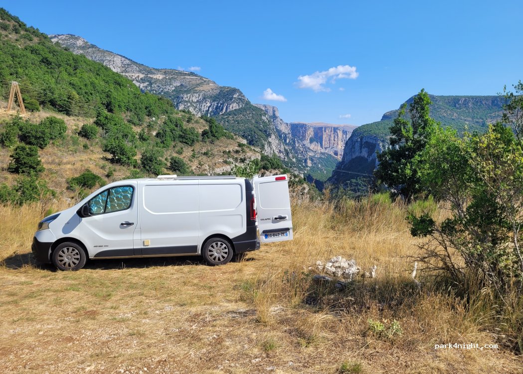 Joli spot avec vue sur le haut des gorges (pas de vue sur l’eau). Accès par un chemin de cailloux, praticable en van mais attention par temps humide ça peut patiner. Beaucoup d’espace, possible pour plusieurs vans sans se gêner. Nuit très calme, très peu de passage sur la route derrière.