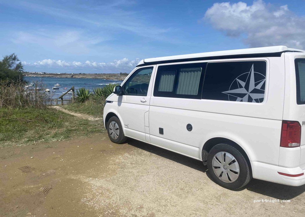 Parfait pour les vans. Hauteur 2,10m. Calme. Belles balades à faire le long de la côte. Pêche à pieds si l’on aime. Petite plage familiale.