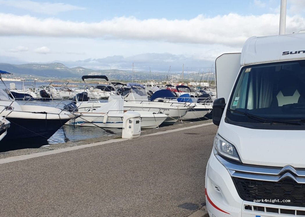 Parking gratuit de 18h à 9h bien pour passer la nuit. Sans service, on ne peut pas passer la nuit du mercredi au jeudi : marché le jeudi. Gratuit jusqu'au 1er mai. Toilettes en bout de parking. Île du Gaou accessible à pied en 10 minutes.