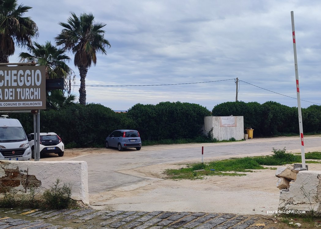 Small carpark, signposted as parking for scala dei Turchi, kiosk closed so payment impossible both days/nights we went in December, but a fee would be in place in season for sure. Flat, quiet, police were there when we arrived, exchanged smiles and went on their way. Right next to Beach and a 5 min walk on beach gets you to Scala Dei Turchi. We did this in 9m van, so turn is possible for big vans.