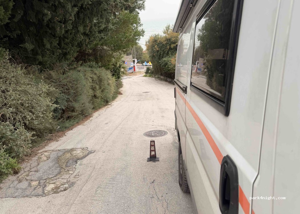 Avec en tête d’épingle et descente assaut raide. Parking légèrement en pente. La mer est juste à côté. Nous y avons dormi une nuit et c’était calme. Pas payant actuellement.
