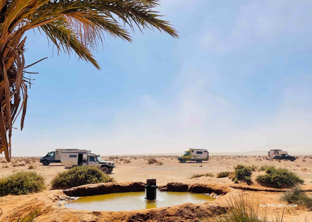 Route de sable de 9km depuis Tighmert ok pour tous véhicules mais extrêmement poussiéreuse. Beaucoup de vent donc beaucoup de sable et poussière partout dans le véhicule. Des nuées de mouches arrivent avec les dromadaires. La source est chaude seulement à la sortie du tuyau, sinon l’eau est plutôt tiède et bien sûr marron avec un faible niveau.