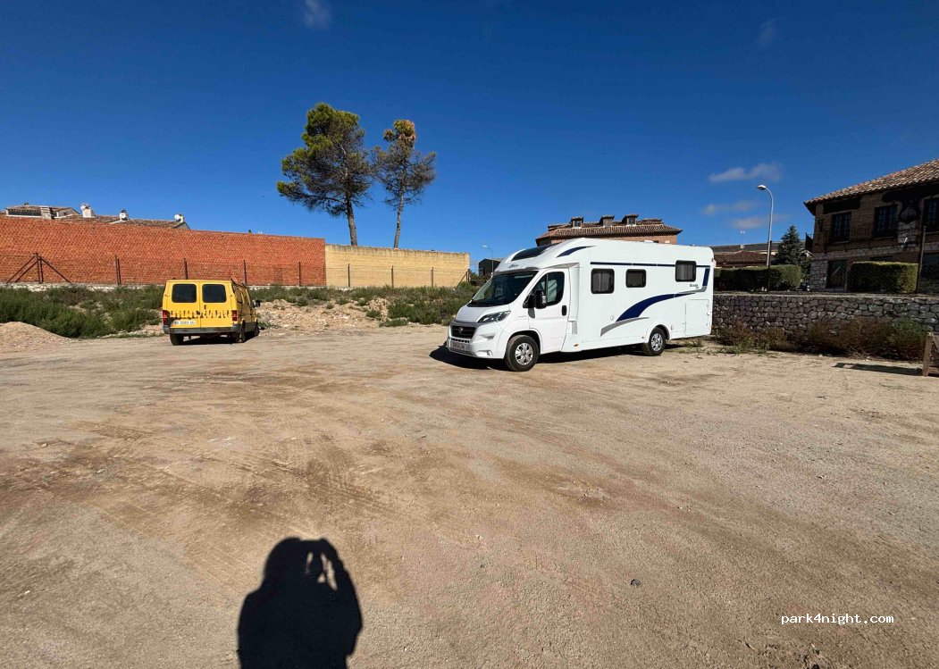 Parking de tierra sin servicios. Algunos baches pero sin problemas para las AC. Tiene iluminación nocturna y es bastante grande, pasamos una noche tranquila. A 10 minutos a pie de la Plaza Mayor.