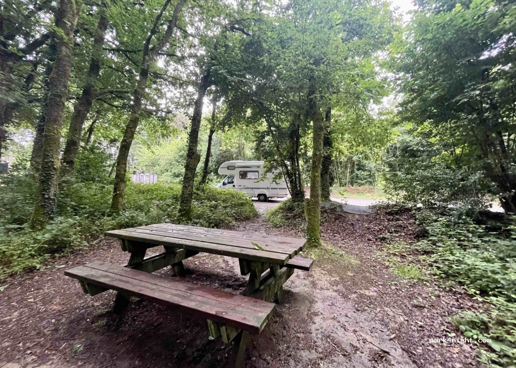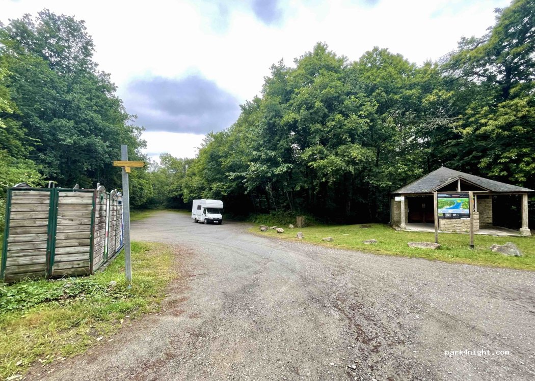 Parking voitures et camping car/van. Il y a du passage en journée (lié au parking) mais le soir très calme. Rivière en bas de la route avec une bonne remontée au retour, mais très boisé et donc agréable. Le long de la rivière, il y a une crêperie, location de canoë et accrobranche.