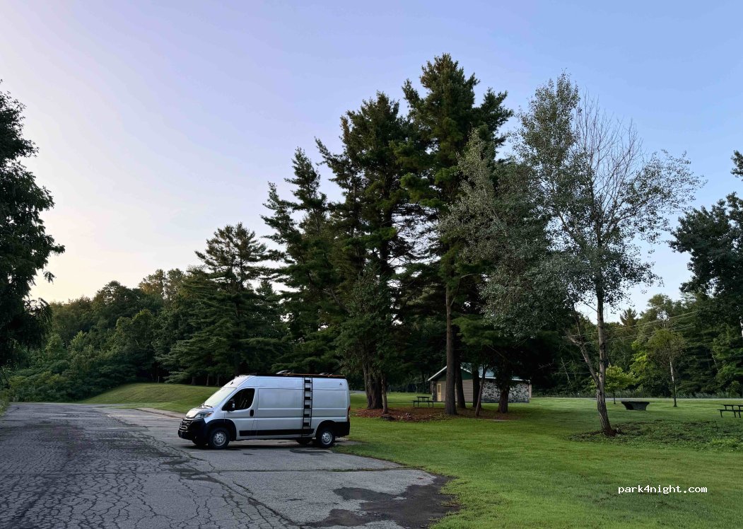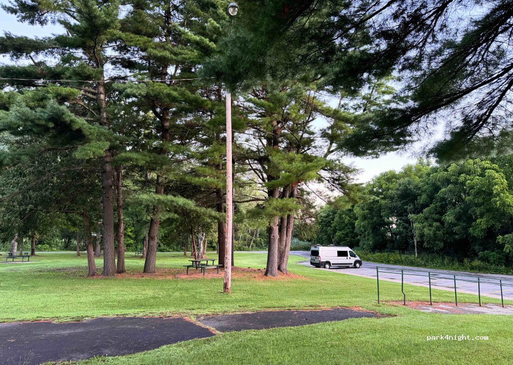 Je suis resté toute la nuit. Personne est venue me déranger. Endroit tranquille malgré le bruit de fond des voitures sur l’autoroute tout prêt. Grand terrain très propre. Parc à chien. Circuit de golf-Vollet-Ball. Table ping-pong. Une toilette sèche.