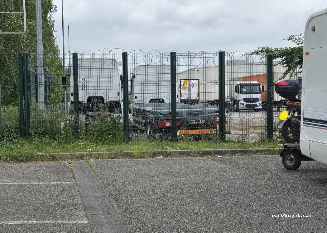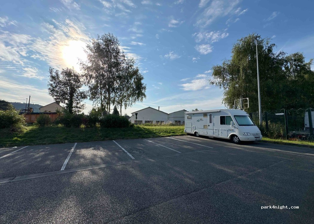 Arrived late and leaving early, so ok for a short night's stopover. Some noise from other vehicles from 6am-ish. At 8am, very heavy machinery arrived at some demolition works right next to the car park. As a previous user said, it's a public car park, not really suitable for larger motorhomes. We (7.5m) were able to fit our overhang over the grass banking.