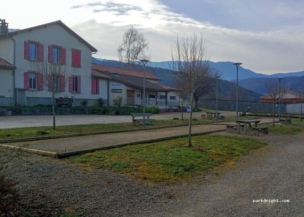 En face de la mairie, dans un cadre champêtre. Vue sur les montagnes. Eau, électricité, poubelles, vidanges, tout est gratuit. il y a 2 tables en ein air et une table sous un abri en bois. 2 terrains de pétanque également. Merci mille fois à la commune .