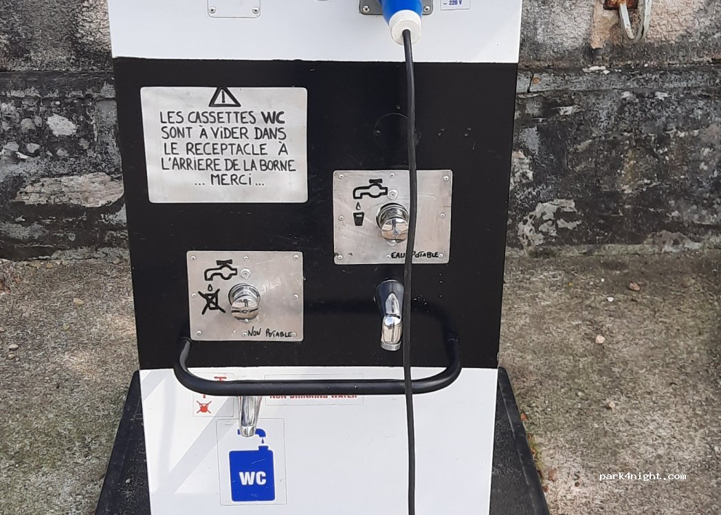 3 emplacements. 1 borne électrique (celle sur la borne vidange et eau). remplissage, vidange WC et eaux sales. situé juste en face de la mairie. très belle vue. avec Orange pas de réseau, nous étions en H voir rien du tout donc j'imagine que c'est selon l'opérateur.