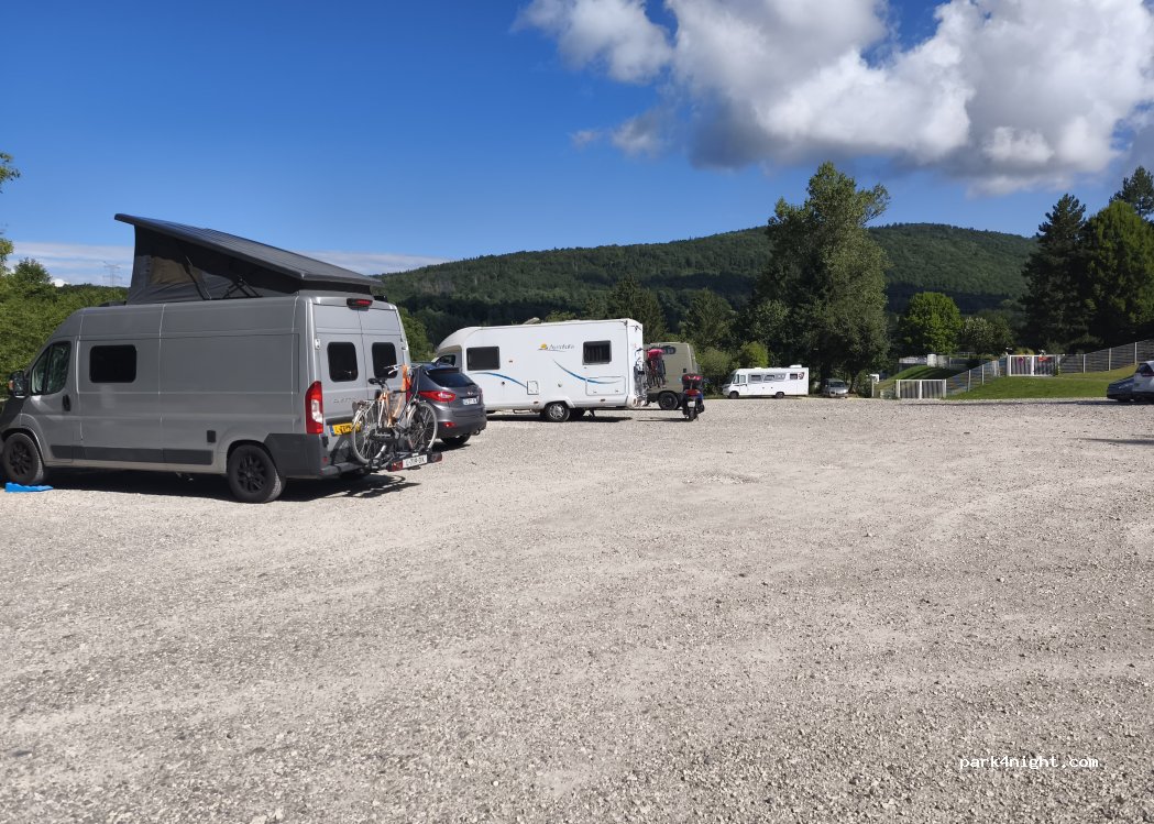 Easy to access, calm to sleep (in March there where two other vehicles staying overnight on Friday evening). Toilets were closed, but it's only a 5 minute drive to Cruseilles where you'll find plenty of restaurants for eating and using their bathroom. Nice walk around the lake (1km). The pump track nearby was in great shape. Pretty flat, although not 100%. Feels save and clean.