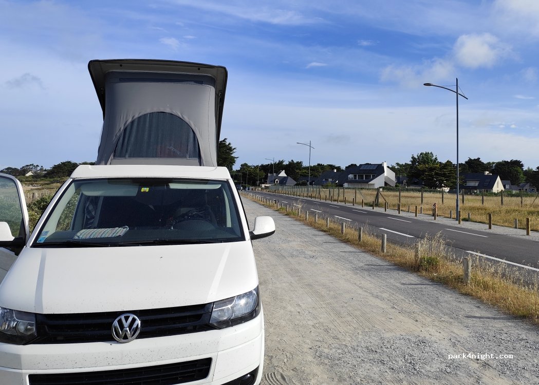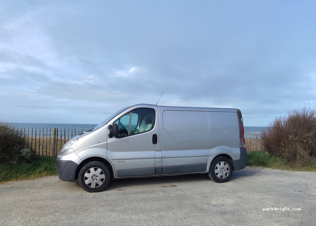 Super emplacement avec vue sur mer et un chemin direct à celle ci. Nous étions les seuls sur le parking pour un samedi soir. Un peu de passage de véhicules mais rien de gênant. Le van fait 2m04 et nous passions avec de la marge encore sous le portique.