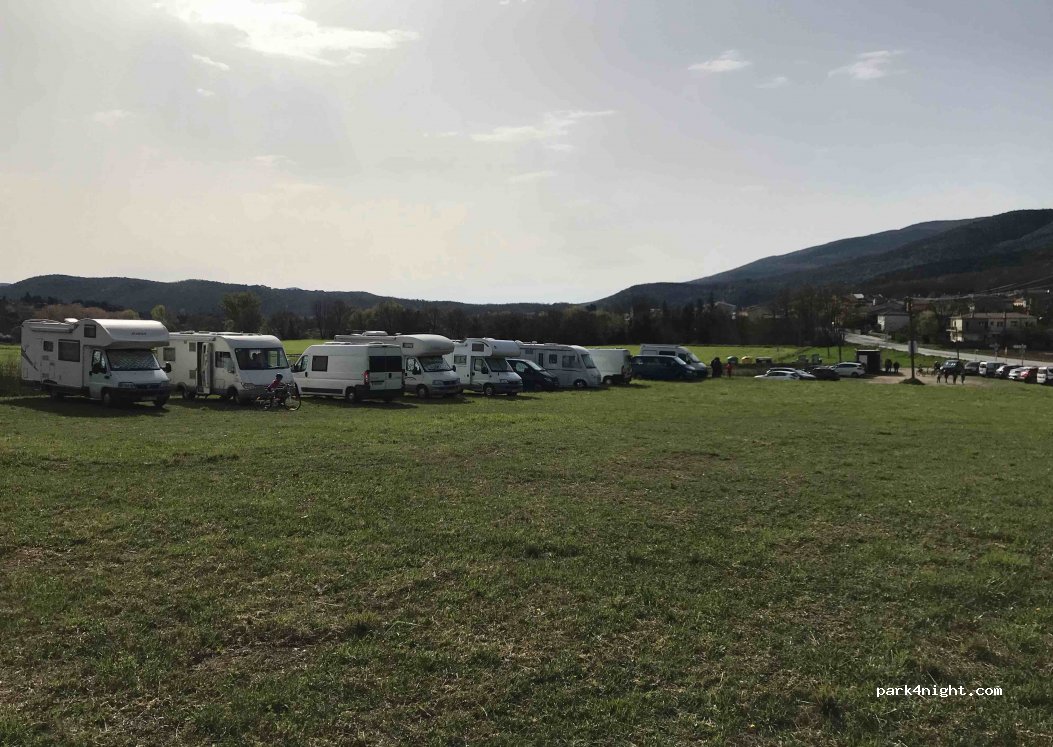 Gran aparcamiento a la entrada del pueblo, de hierba. Sin servicios pero gratuito y en el centro de información nos confirmaron que se podía pernoctar. La carretera esta cerca pero con poca circulación por la noche. Ideal para hacer la vía verde o las caminatas a las diferentes Gorges del pueblo, que merecen mucho la pena.