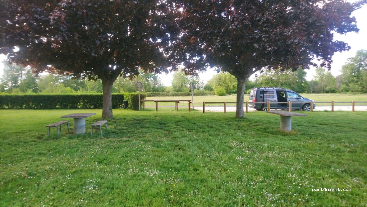 Endroit très calme près d'une aire de jeux pour enfants. difficile d'accès pour un CC, mais pas pour un fourgon (virage très serré et étroit. poubelles et tables pique-nique sur place. ravi !!