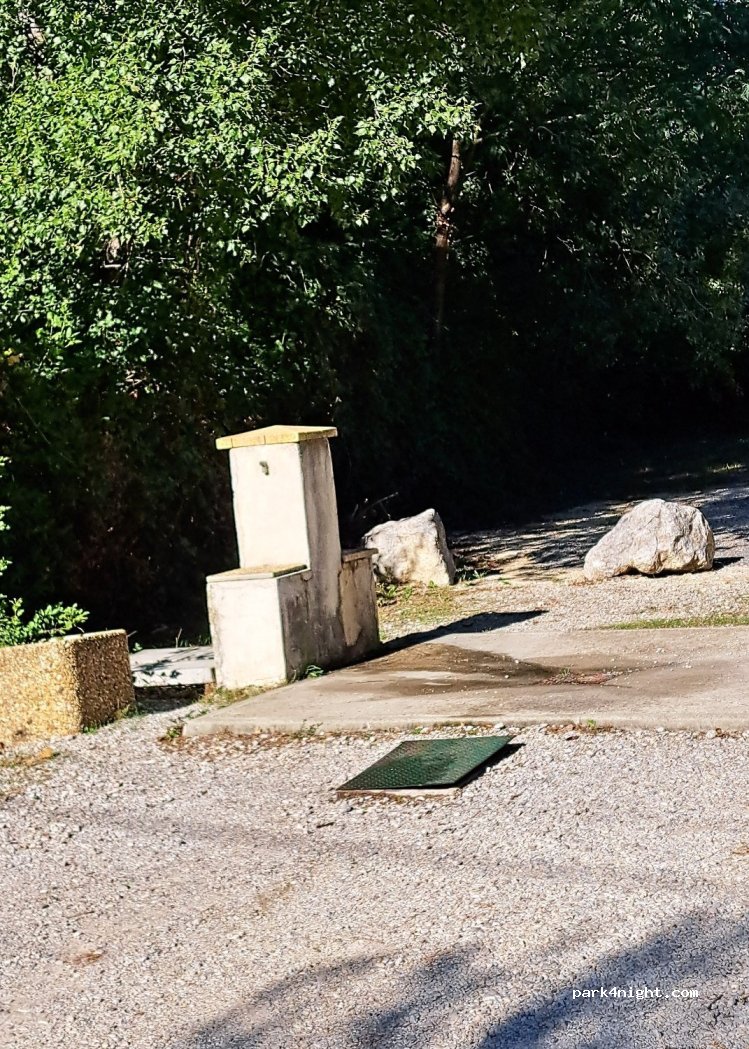 Punto de agua libre con vaciado de aguas grises y negras. Se ve bastante bien, pero ayuda. Al borde de la vía, que puede acomodar una autocaravana a la vez, junto a un estacionamiento con barrera a 2,20 metros.