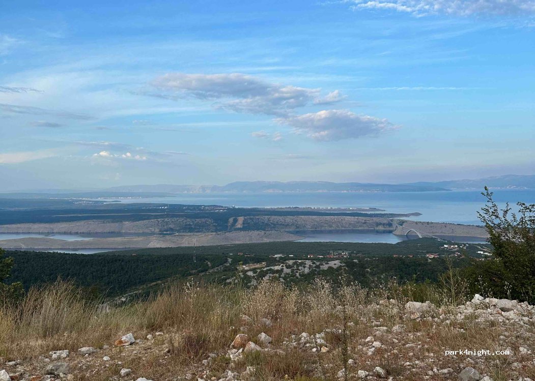 Tolle Aussicht, wunderschön :) der Blick auf KRK und die Brücke ist einmalig. Der Schotterweg ist fahrbar, wir haben einen Fiat Ducato. Wer es einsam mag ist hier genau richtig. Wer sein Fernrohr dabei hat, kann hier auch zahlreiche Schiffe auf dem Meer entdecken.