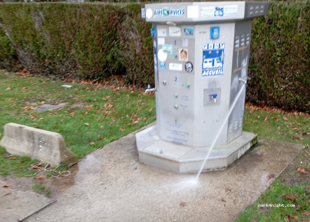 très belle aire très propre et très bien situé a 500m du centre ville très calme quand nous sommes arrivés aujourd'hui le 29/12 vers 14h l'un des robinets des services était ouvert à fond quelle gaspillage et surtout dommage de voir des comportements comme ça nous avons joint une photo encore merci pour cet belle aire