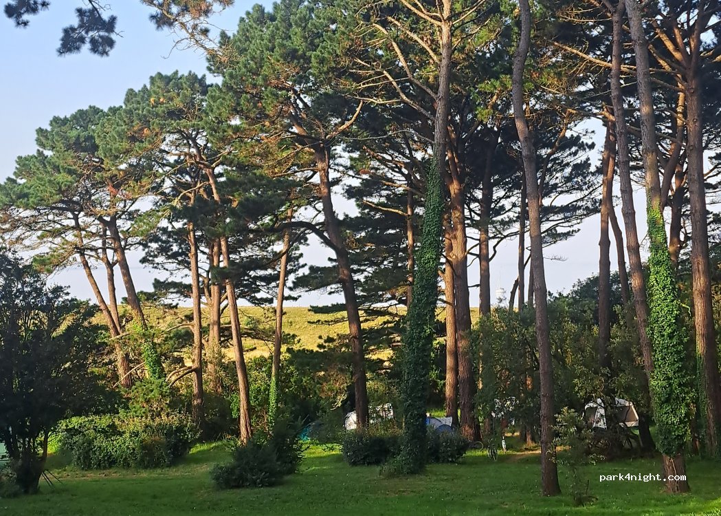 Natural grass pitch, partly under pine trees. Quiet and peaceful setting within a 4-hectare green park, separated from the ocean (Kervert Beach) by a natural lagoon. Roads are far from the pitches. For lovers of nature and tranquility.