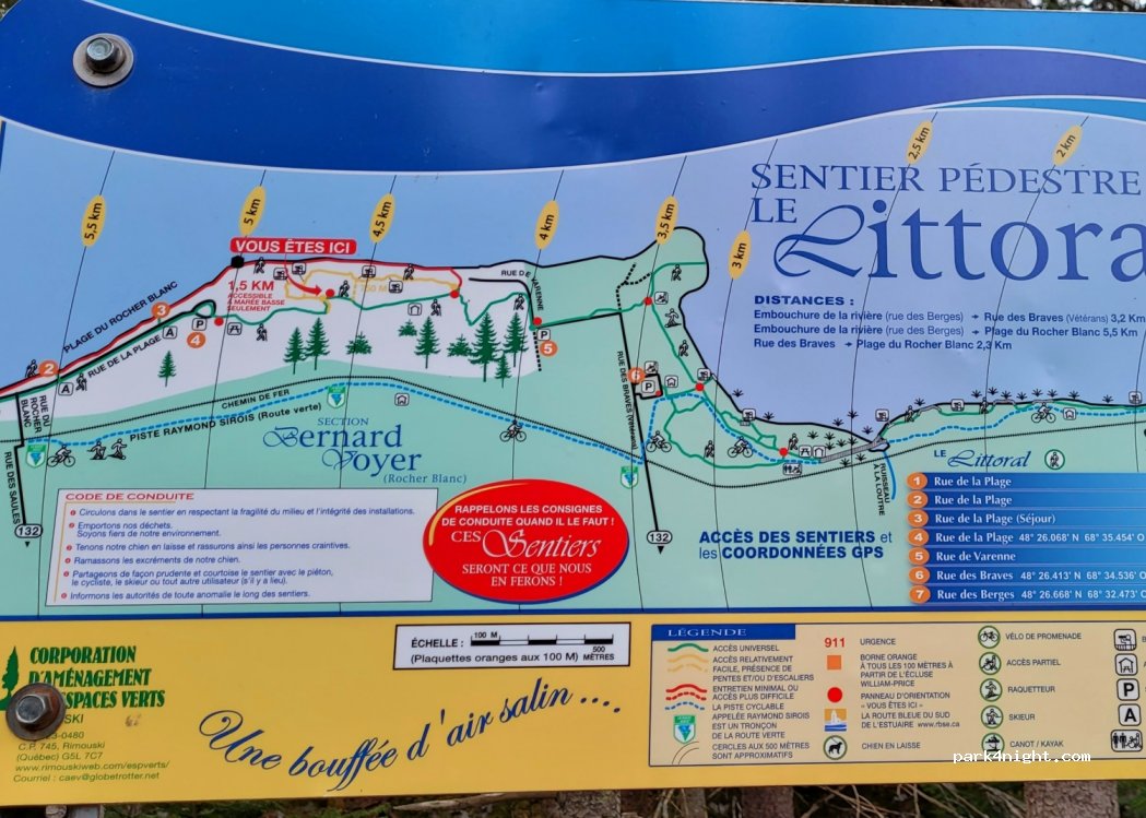 Bel endroit, facile de stationner avec notre 30 ‘’. Super belle randonnée au matin sur le Rocher Blanc jusqu’à la plage.