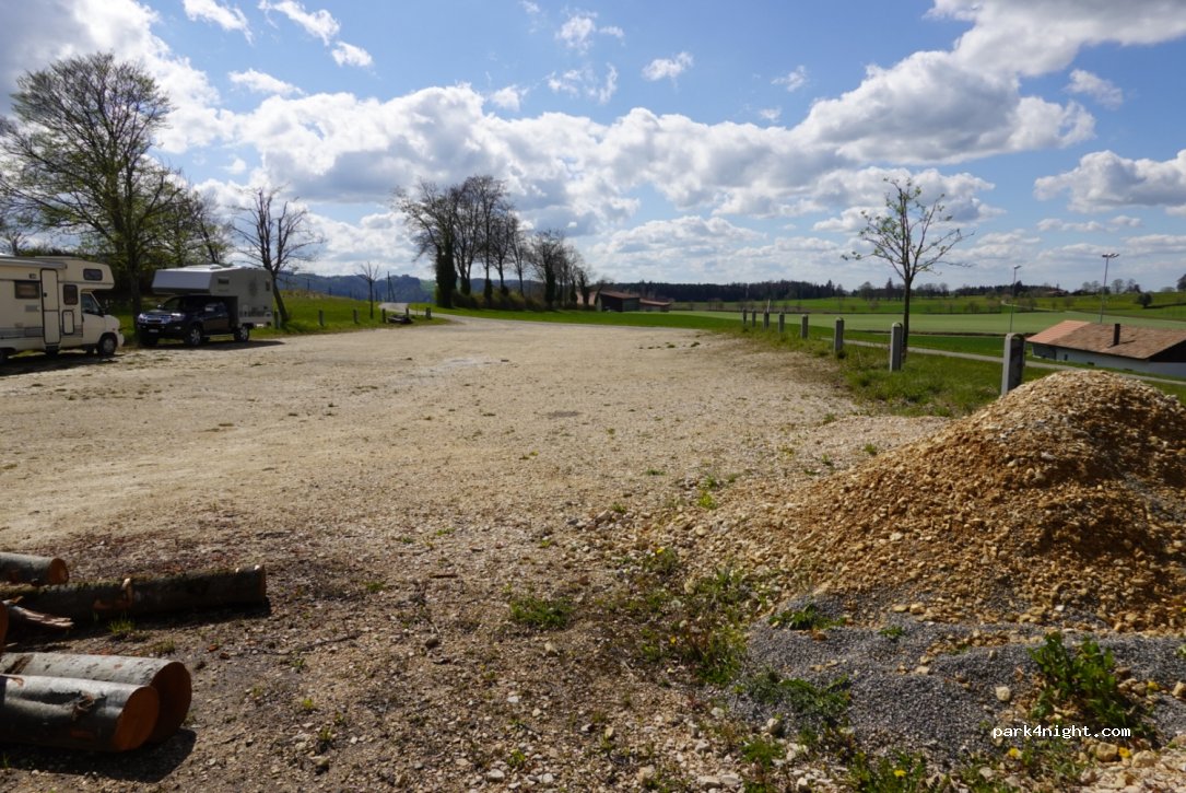 Ziemlich ebener kiesiger Parkplatz beim Fussballfeld. Schöne Aussicht über das Hochplateau. Einen Grill und einen grossen Holztisch mit -bänken hat es auch. Es ist sauber und aufgeräumt, genau so wie wir alle es gerne haben.
