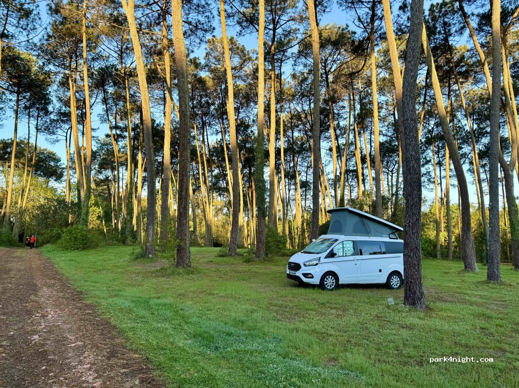 Naturcampingplatz „La Teouleyre“, im Schatten von Pinien oder Eichen, sehr saubere Sanitäranlagen, Stromanschlussmöglichkeit. Viel leiser als in einem Wohnmobilbereich geparkt.
